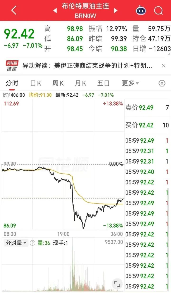当地时间4月17日,截至收盘,纽约商品交易所WTI原油期货跌7.86%,收报84.0美元/桶,盘中一度跌超12%、跌破80美元关口;布伦特原油期货跌7.01%,收报92.42美元/桶,盘中也一度跌幅超12%。