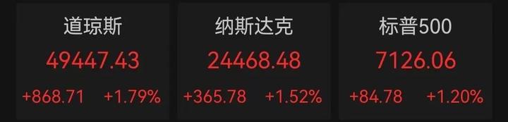 截至收盘,道指涨1.79%报49447.43点;标普500指数涨1.2%报7126.06点;纳指涨1.52%报24468.48点,连续13个交易日上涨。据外媒报道,标普500指数是首次收于7100点上方,同时,纳指创下1992年以来最长连续上涨纪录。