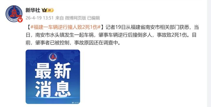 记者19日从福建省南安市相关部门获悉,当日,南安市水头镇发生一起车祸,肇事车辆逆行后撞倒多人,事故致2死1伤。目前,肇事者已被控制,事故原因还在调查中。