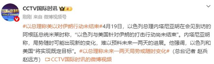 4月19日,以色列总理内塔尼亚胡在会见到访的阿根廷总统米莱时称,“以色列与美国针对伊朗的打击行动尚未结束”。内塔尼亚胡称,局势随时可能出现新的变化,难以预料未来一两天的进展。他强调,以色列和美国“将实现既定目标”。