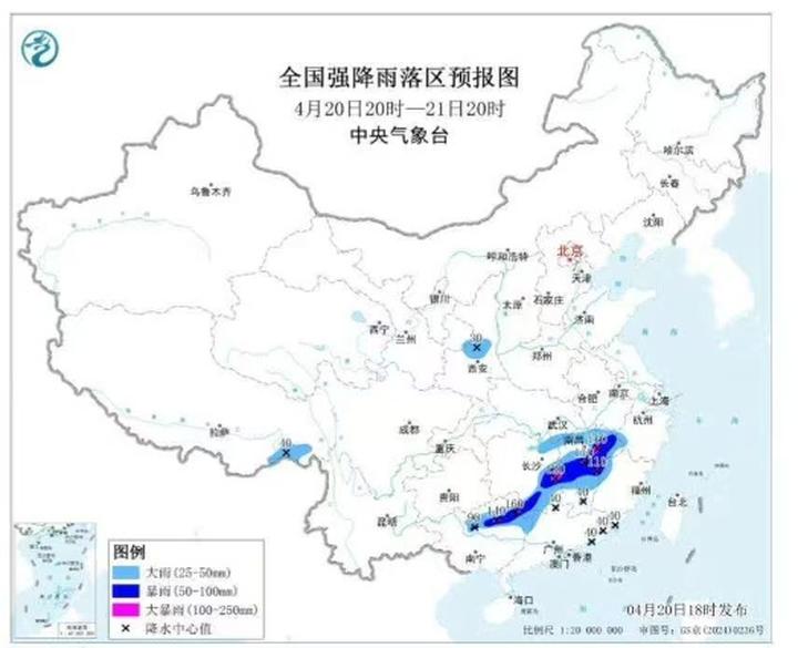 预计,4月20日20时至21日20时,广西北部、湖南南部和东部、江西中北部以及陕西中部等地部分地区有大到暴雨,其中,广西东北部、湖南南部和东部、江西中部等地局地有大暴雨(100~160毫米)。上述部分地区伴有短时强降水(最大小时降雨量20~40毫米,局地可超过50毫米),局地有雷暴大风或冰雹等强对流天气。