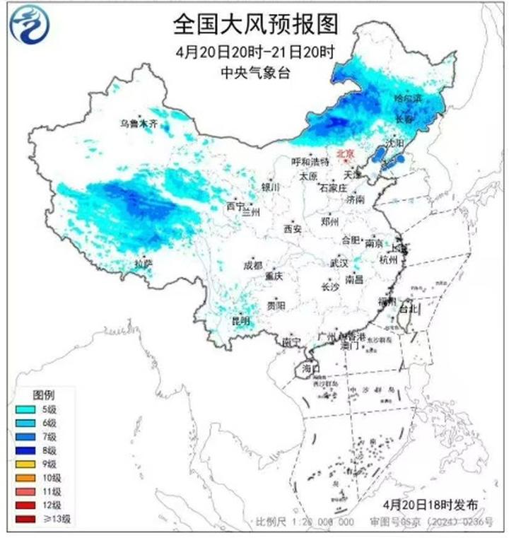 中央气象台4月20日18时发布大风蓝色预警: