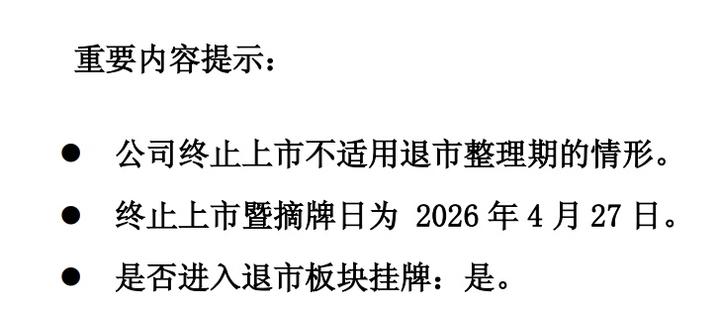 2026年1月27日,公司披露业绩预告,预计2025年实现利润总额-3900万元至-4500万元;归母净利润-3950万元到-4550万元;扣非净利润-4000万元到-4600万元;扣除与主营业务无关的业务收入和不具备商业实质的收入后的营业收入为8622万元左右,触发退市规定。