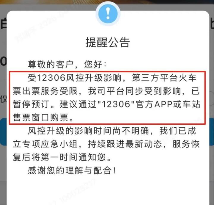 上述通知还称,因业务高峰,部分订单可能出现出票延迟、无法取消或退改失败。为确保贵司员工出行不受影响,如有紧急行程且公司政策允许,建议优先通过12306官方渠道自行购票后报销。本次系统风控升级的具体影响时间尚不明确,我们已成立专项应急小组;技术团队正在紧急处理中。