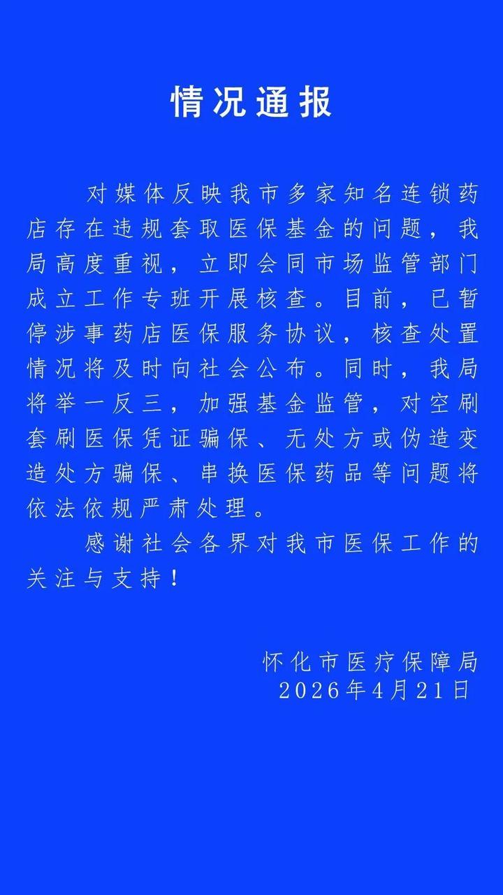 当日,怀化市医疗保障局发布情况通告称,对媒体反映该市多家知名连锁药店存在违规套取医保基金的问题,该局高度重视,立即会同市场监管部门成立工作专班开展核查。目前,已暂停涉事药店医保服务协议,核查处置情况将及时向社会公布。