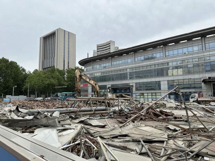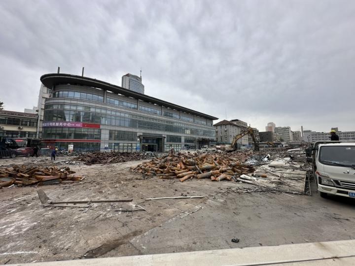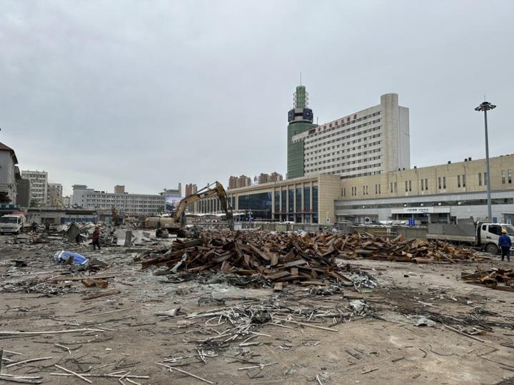 此外,位于南广场火车站西侧的天龙大厦拆除工程已经进入尾声。记者现场看到,大厦墙体几乎全部拆除完毕,多台不同功能的大型机械正联合作业分拣、清理残余建材,钢筋、混凝土块等在工地旁整齐堆放。