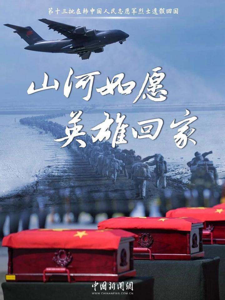 +订阅1950年10月,中国人民志愿军跨过鸭绿江,浴血奋战、保家卫国,无数英雄儿女将青春与生命留在了异国他乡。去时少年身,归来英雄魂。今天,第十三批在韩中国人民志愿军烈士遗骸回国。转发,传递,致敬!一起接英雄回家!
