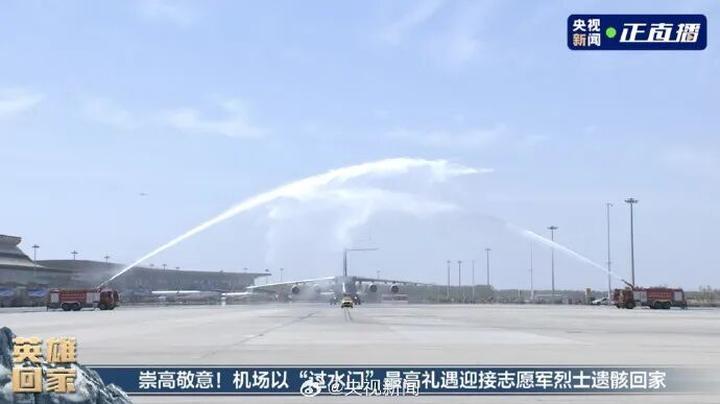 塔台:荣归50,感谢护送志愿军忠烈荣归故土。山河共盼,英雄回家,祖国从未忘记,人民从未忘记。我们以最高礼仪向忠烈致敬!