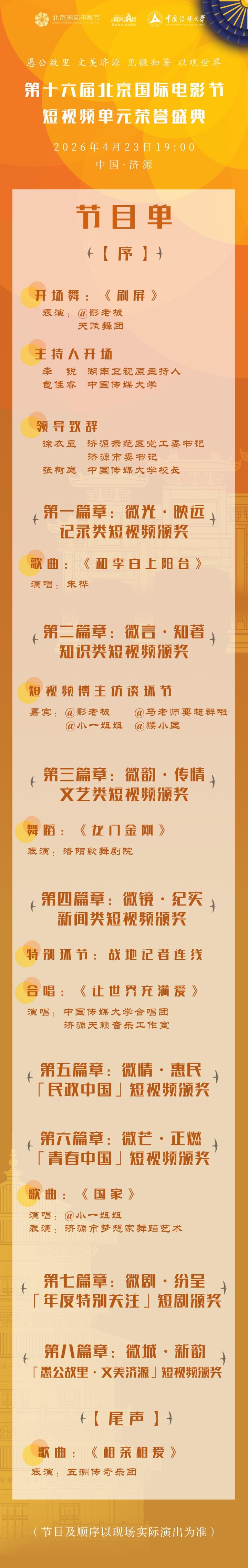 本届荣誉盛典为短视频单元首次走出北京、落地愚公故里济源,在山水之间书写“见微知著、以观世界”的崭新篇章。现场将揭晓各大类别荣誉作品,并同步启动济源微短剧基金与 “文美济源” 主题赛道。盛典现场群星荟萃,黄奕、黄小蕾、李东学、张光北、张歌、龚锐、朱桦等知名演员与歌手,以及@影老板、@马老师要超群啦、@小一姐姐、@猴小匡等嘉宾将共同出席。在表演环节,这场打破次元的光影盛宴,不但会让龙门金刚在愚公剧场重现经典,更将引领观众感悟移山精神,与《让世界充满爱》隔空共振,《和李白上阳台》《国家》《相亲相爱》等歌舞将青春脉动与千年古韵完美融合。更多精彩环节,敬请期待!