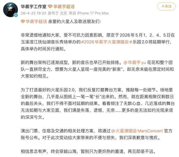 4月22日晚,歌手华晨宇在社交平台发文称,其火星演唱会因不可抗力延期。
