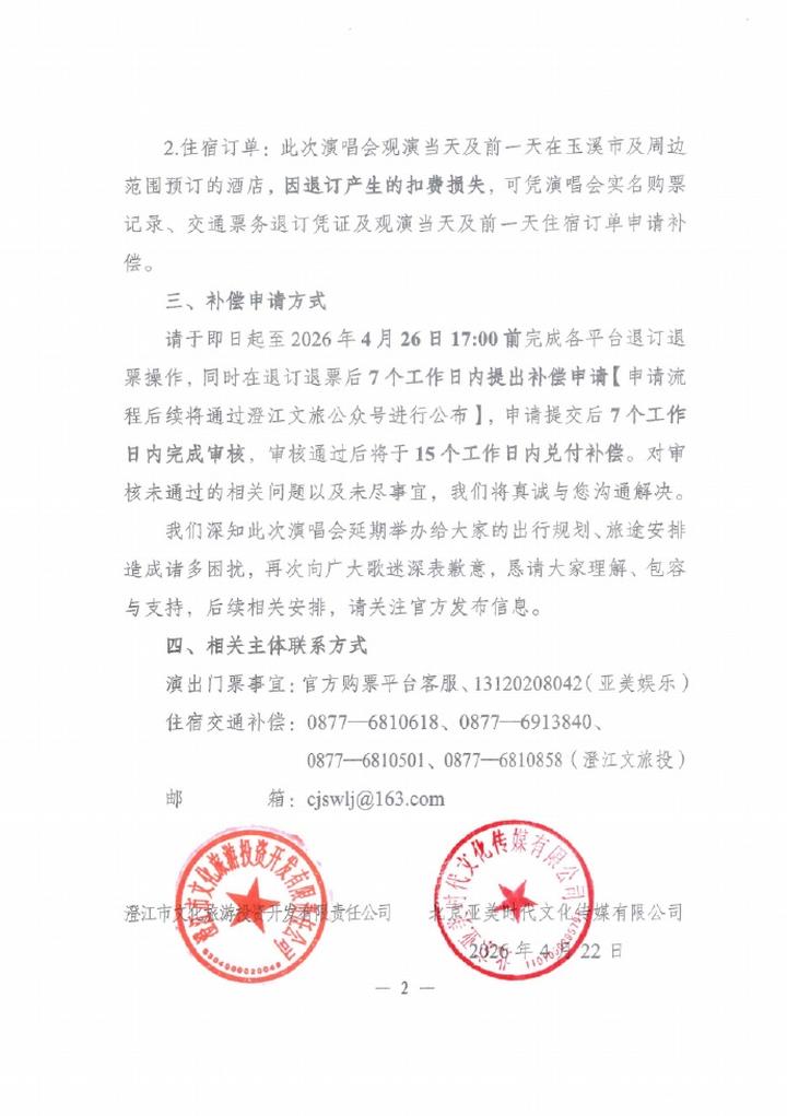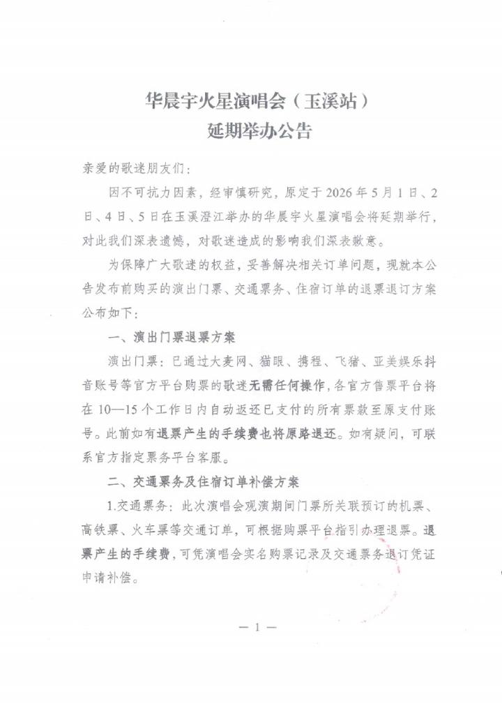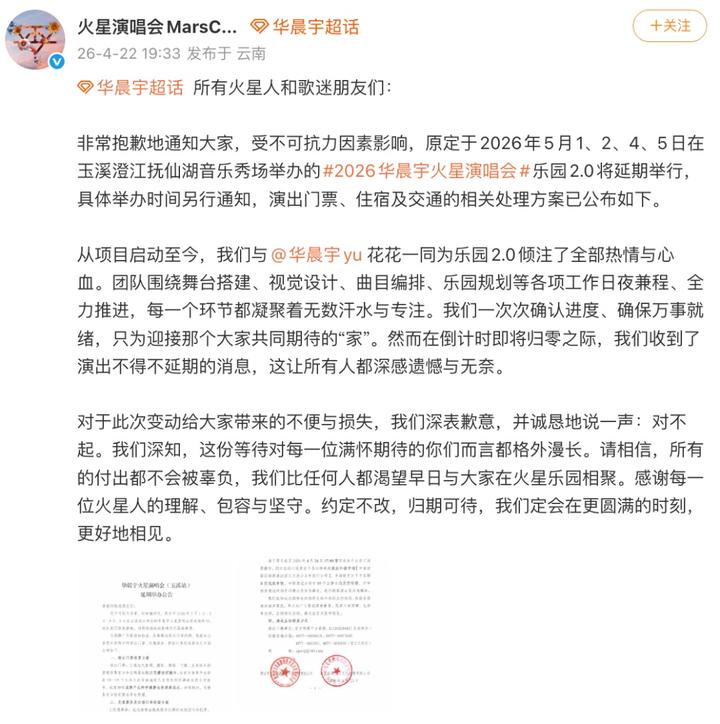 随后华晨宇工作室发通知表示:受不可抗力因素影响,原定于2026年5月1、2、4、5日在云南玉溪澄江抚仙湖音乐秀场举办的2026华晨宇火星演唱会乐园2.0将延期举行,具体举办时间另行通知。火星演唱会官方微博将公布演出门票退票以及交通、住宿补偿方案。