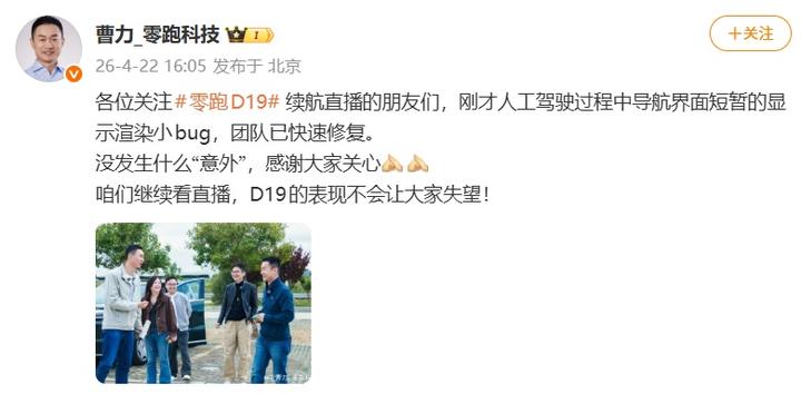 南都N视频记者注意到,零跑科技高级副总裁曹力发文回应此事称,“刚才人工驾驶过程中导航界面短暂的显示渲染小bug,团队已快速修复。”