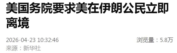 美国国务院领事事务局22日在社交媒体上发文说,鉴于伊朗已宣布部分重开领空,美国在伊朗公民应立即离境。
