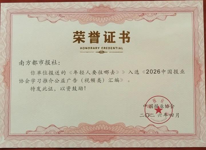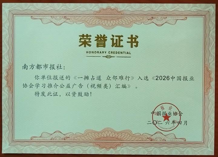 此外,南方都市报的两件公益广告作品——《年轻人要往哪里去》和《一摊占道 众邻难行》也成功入选《2026中国报业协会学习推荐公益广告(视频类)汇编》,充分彰显了南都在内容创意与社会责任传播方面的深厚积淀。