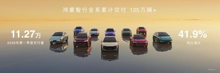 2026年第一季度,国内新能源市场渗透率已突破52%。问界品牌一季度累计销量达7.21万辆,同比增长57.66%,延续强劲增长势头。其中,问界品牌2026年1月交付40016辆,同比增长83%,占鸿蒙智行整体交付量的69.1%,成为绝对销量支柱。回顾2025年全年,问界累计交付量突破42万辆,以近40万元的平均成交价格,稳居中国豪华汽车品牌销量首位。鸿蒙智行全系累计交付已突破135万辆,主动安全已避免碰撞超394万次,华为乾崑智驾累计辅助驾驶里程突破102亿公里。