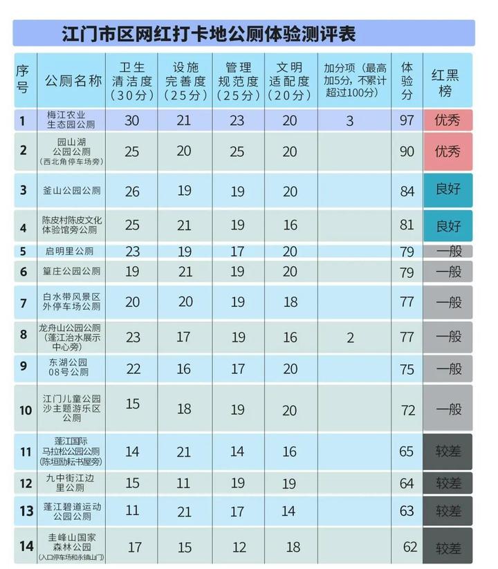 在14间公厕中,蓬江国际马拉松公园公厕(陈垣励耘书屋旁)和蓬江碧道运动公园公厕因卫生不达标、设施破损等情况被测评为“较差”,被纳入黑榜。4月23日,蓬江区农业农村和水利局回应称,该局已第一时间组织核查并部署全面整改,整改分阶段推进,将在10个工作日内,完成整改验收,巩固整改成效,建立长效管护机制。