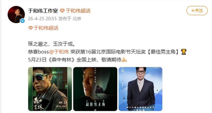 于和伟工作室发文:琢之磨之,玉汝于成。恭喜于和伟荣获第16届北京国际电影节天坛奖。