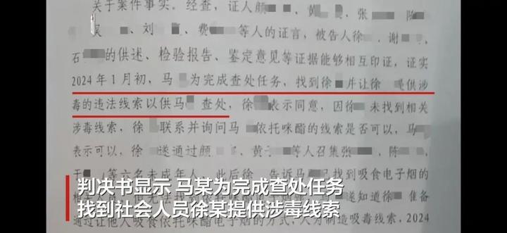 判决书显示,马某为完成查处任务找到社会人员徐某提供涉毒线索,2024年1月徐某通过他人召集6名未成年人后,马某将含有依托咪酯的电子烟交给徐某,徐某等人在一家宾馆内将电子烟交由6名未成年人吸食,随后联系马某将6名未成年人查获。
