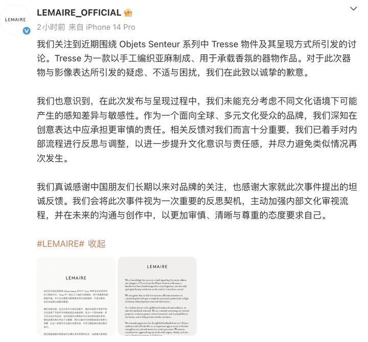 4月26日,@LEMAIRE_OFFICIAL 发文致歉:我们关注到近期围绕Objets Senteur系列中Tresse物件及其呈现方式所引发的讨论。Tresse为一款以手工编织亚麻制成、用于承载香氛的器物作品。对于此次器物与影像表达所引发的疑虑、不适与困扰,我们在此致以诚挚的歉意。