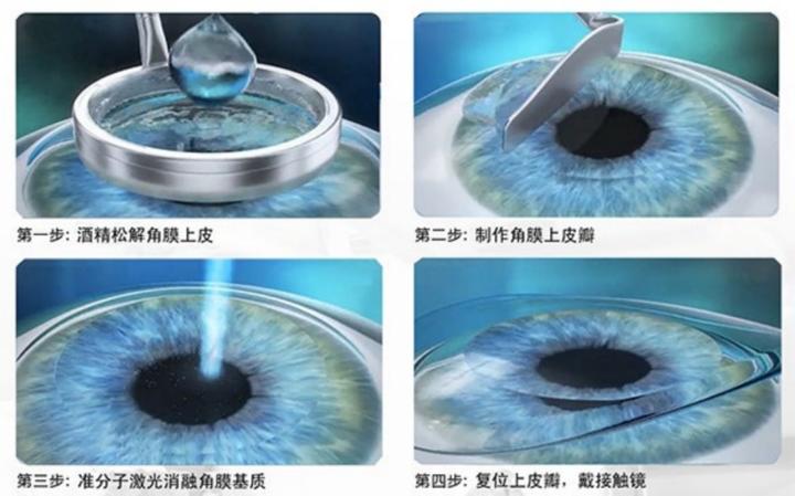 角膜上皮刀制作角膜上皮瓣,在暴露的角膜基质床上进行准分子激光气化切削,然后将上皮瓣复位,术后戴角膜接触镜3—5天。