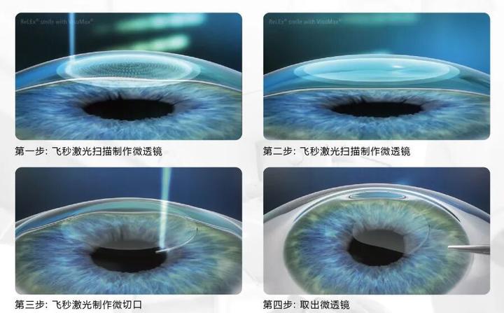 全飞秒激光术使用飞秒激光在角膜内部通过二次深度不同的层间爆破,将要切削的角膜基质完整塑形,然后通过一个2—4mm的微小切口取出,完成手术。