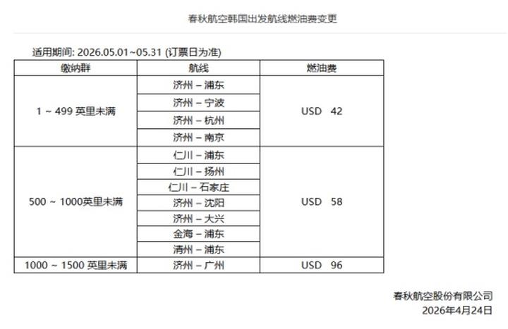 不过,春秋航空日前在官网发布韩国出发航线燃油费变更的通知,5月1日至5月31日燃油费将再迎调整。下一轮国内航线燃油费的调价窗口或将在5月5日开启。