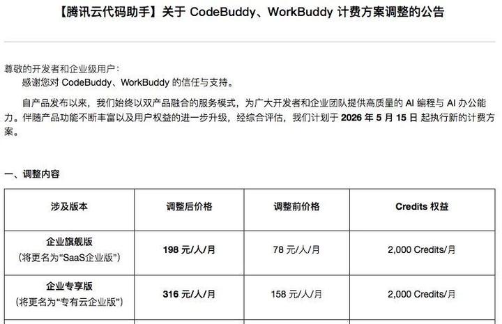 消息面上,4月28日,腾讯云发布关于CodeBuddy、WorkBuddy计费方案调整的公告,计划于2026年5月15日起执行新的计费方案。其中,企业旗舰版将更名为“SaaS企业版”,价格由“78元/人/月”调整为“198元/人/月”;企业专享版将更名为“专有云企业版”,价格由“158元/人/月”调整为“316元/人/月”。