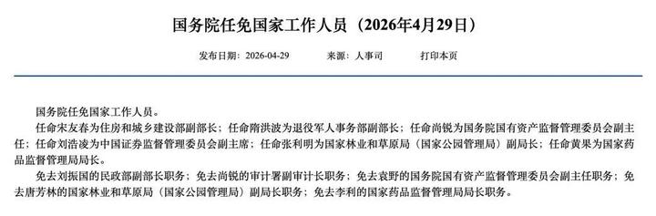 据人力资源和社会保障部网站29日消息,国务院任免国家工作人员——
