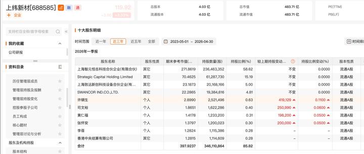 备受市场关注的是,上纬新材一季度末的前十大流通股东中,出现了李蓓的身影。截至一季度末,李蓓新进该公司前十大流通股东名单,持股数量为111.54万股,期末持股市值为1.28亿元。