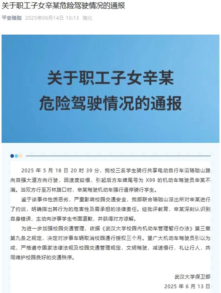 据武汉大学官方微信公众号“平安珞珈”6月14日消息,武汉大学保卫部发布关于职工子女辛某危险驾驶情况的通报: