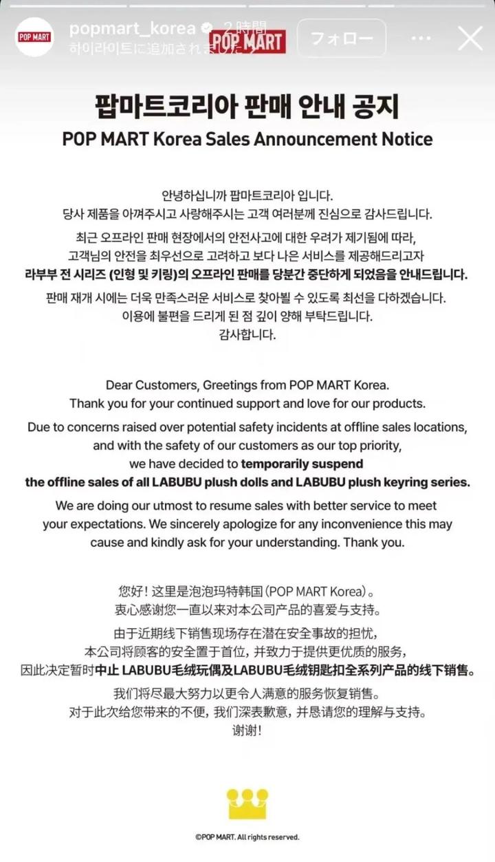 LABUBU韩国线下销售暂停