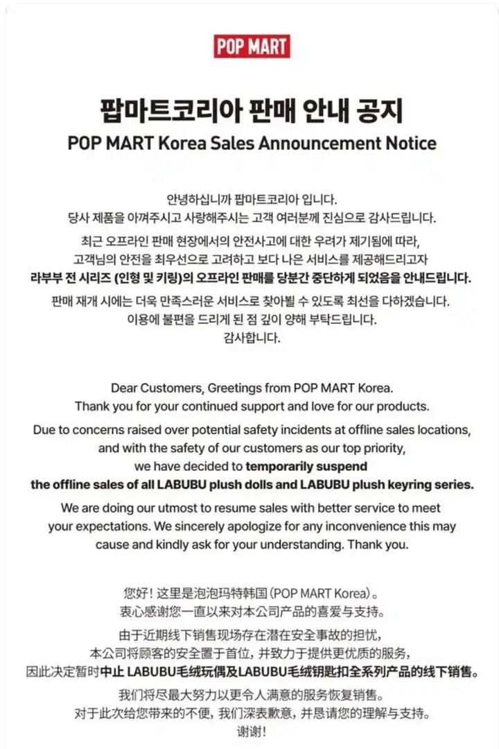 6月14日,泡泡玛特韩国发布公告称,由于近期线下销售现场存在潜在安全事故的担忧,决定暂时中止LABUBU毛绒玩偶及LABUBU毛绒钥匙扣全系列产品的线下销售。公司将尽最大努力以更令人满意的服务恢复销售。