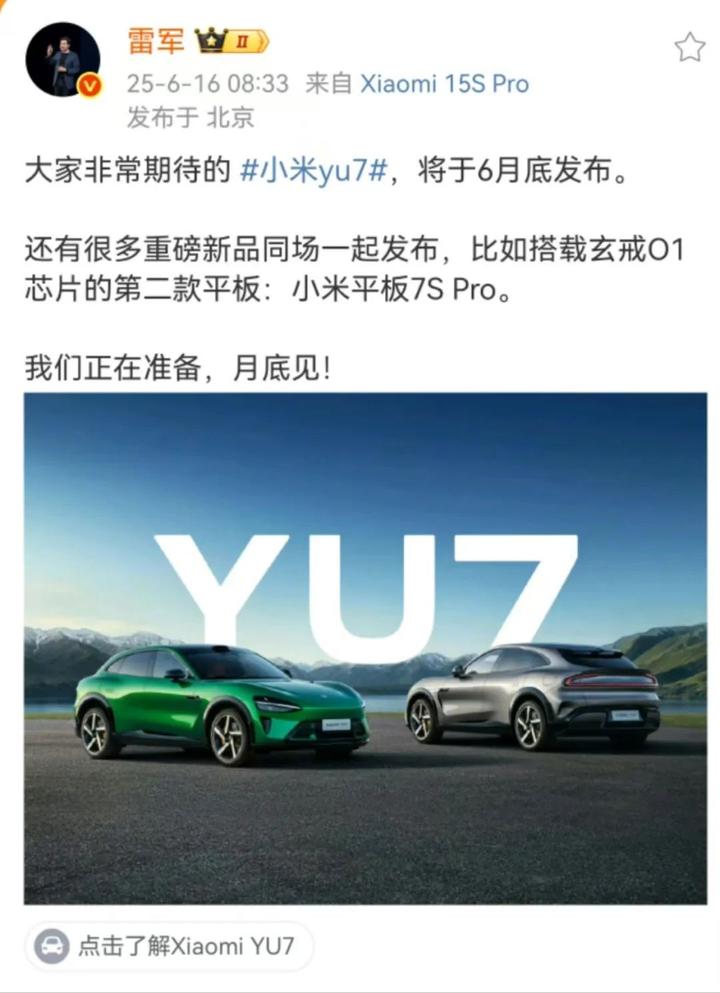 小米集团创始人、董事长兼CEO雷军6月16日在其微博发文称,小米YU7将于6月底发布。还有很多重磅新品同场一起发布,比如搭载玄戒O1芯片的第二款平板:小米平板7S Pro。