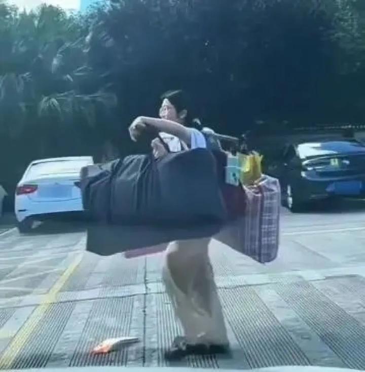 在那个广为流传的视频里,刘同学穿浅色休闲裤配白色短袖,肩上一根木扁担,一头挑着一个大旅行包,左手还提着粉色大包,背上背包也塞满了,热水瓶插在书包上,笃定地往前走。