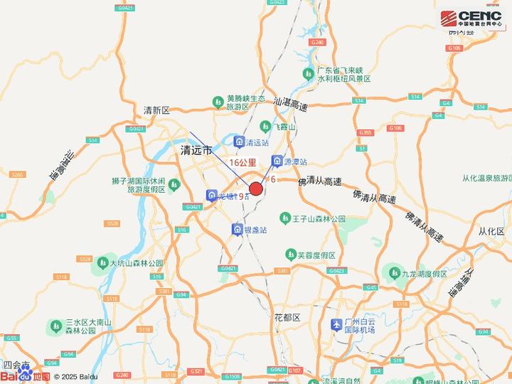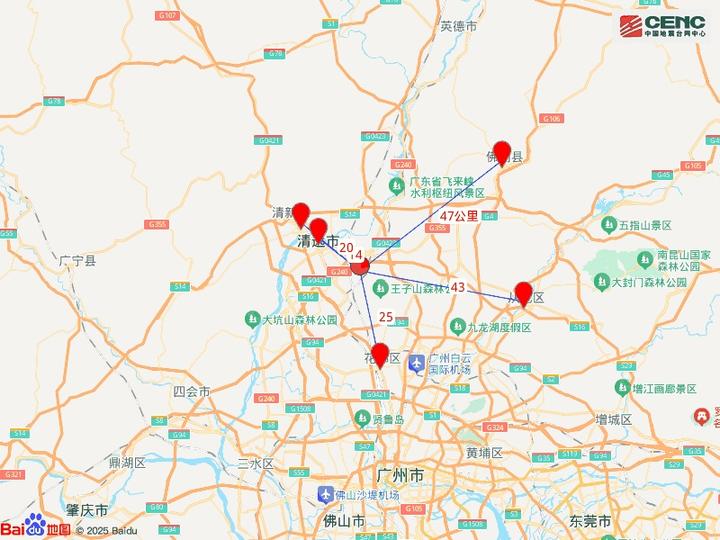 周边县城:震中距清城区14公里、距清新区20公里、距花都区25公里、距从化区43公里、距佛冈县47公里,距清远市14公里,距广州市55公里。