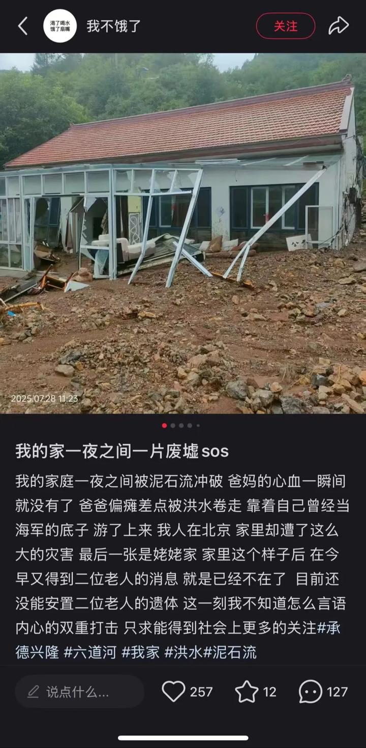 “我不饿了”发帖称自己的亲属受到洪水灾情影响,同时发布了几张房屋被泥巴覆盖、冲毁的图片,时间显示为2025年7月28日11时23分许。