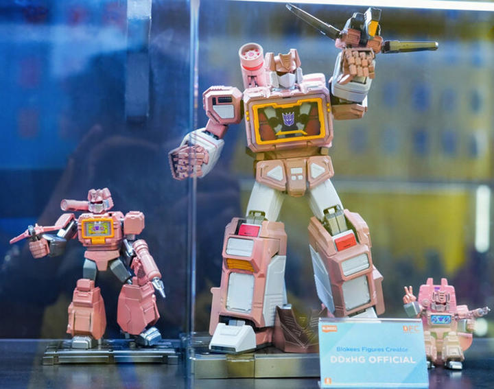 本次展会上,布鲁可展示了多位来自印尼的BFC创作者的优秀BFC作品,体现了多元文化与个性化创意的融合,比如以粉色重新诠释变形金刚经典角色声波的《变革浪潮》,挑战世俗刻板印象;融合威震天配色灵感的《战果累累的复仇女神》,呈现出酷感与力量的全新形象;以及致敬EVA的《幻影(EVA-01配色)》,通过紫色涂装与独特号角,展现未来感十足的机械美学。