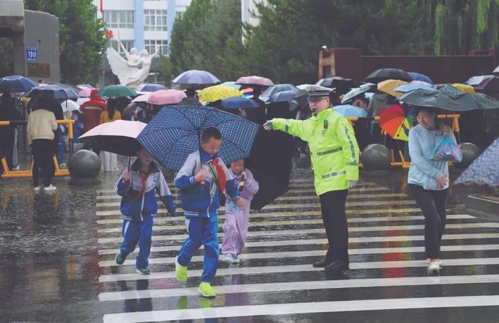 8月27日,甘肃省静宁县公安局交巡警大队民警护送学生过马路。穆伟东 摄