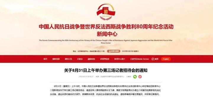 【今日上午10时,第三场记者会!】8月31日上午10时,中国人民抗日战争暨世界反法西斯战争胜利80周年纪念活动新闻中心将在梅地亚新闻中心二层新闻发布厅举办第三场记者招待会。(新华社)
