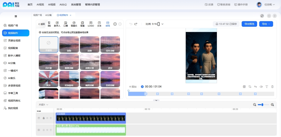 派生万物AI视频工作室实现了从创意概念到完整视频,全流程AI智能化。让非专业人员也能轻松创作出专业水准的内容。