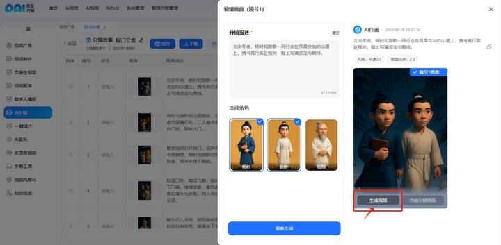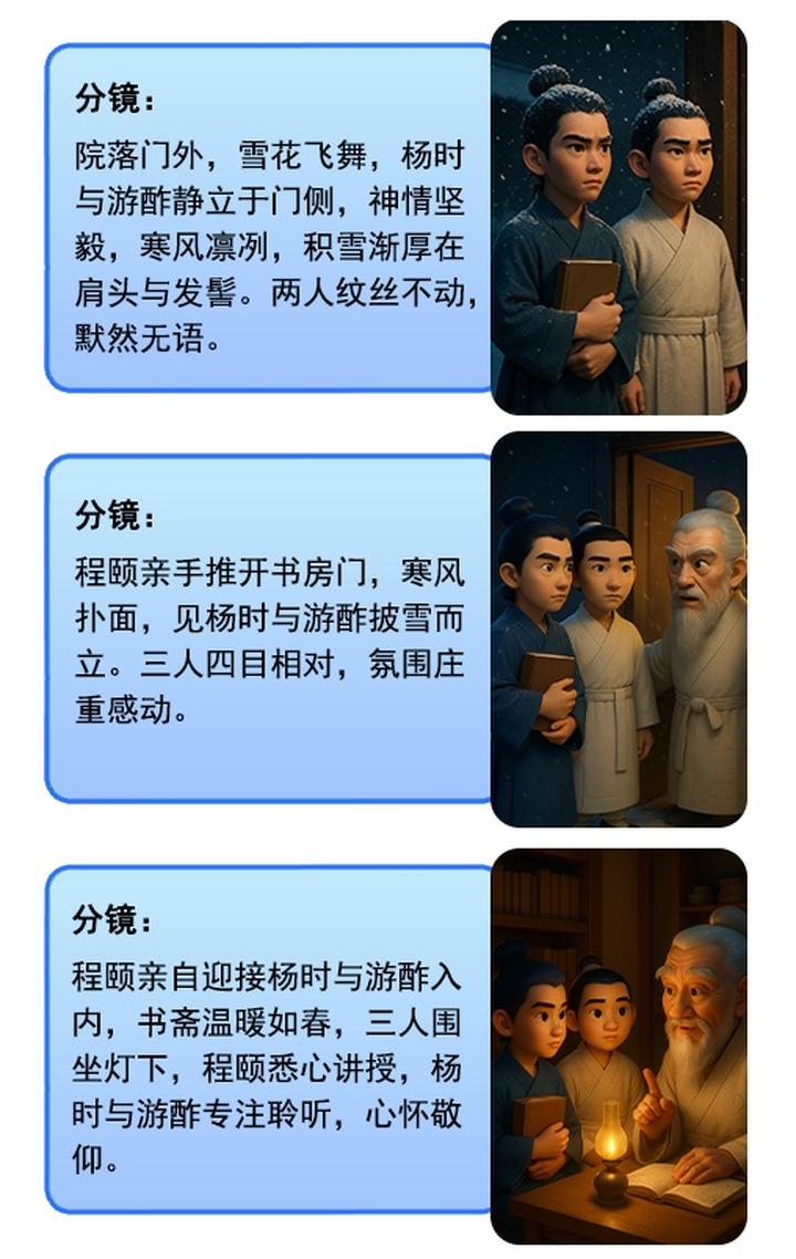 举例:只需输入"程门立雪",AI三分钟就能生成包含画面的完整分镜!