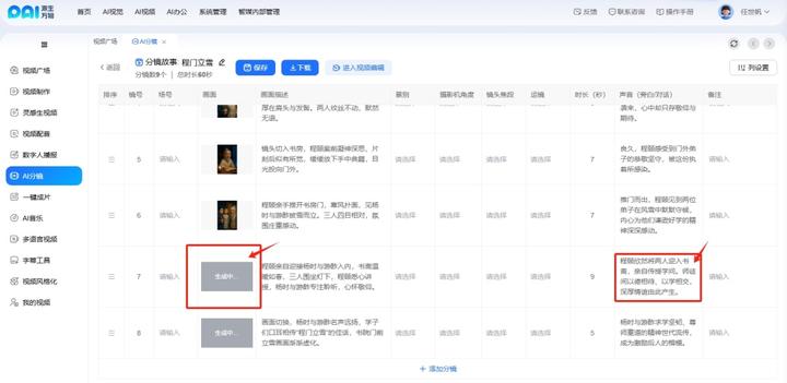 1.系统很快会生成完整的分镜列表,每个分镜都包含可支持编辑的画面、摄影机位、运镜、场景描述和旁白。