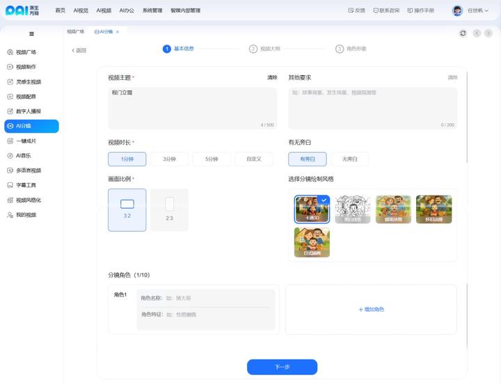 2.在创建窗口中填写基本信息(包含视频主题/视频时长/有无旁白/画面比例/分镜风格等),点击"下一步"按钮