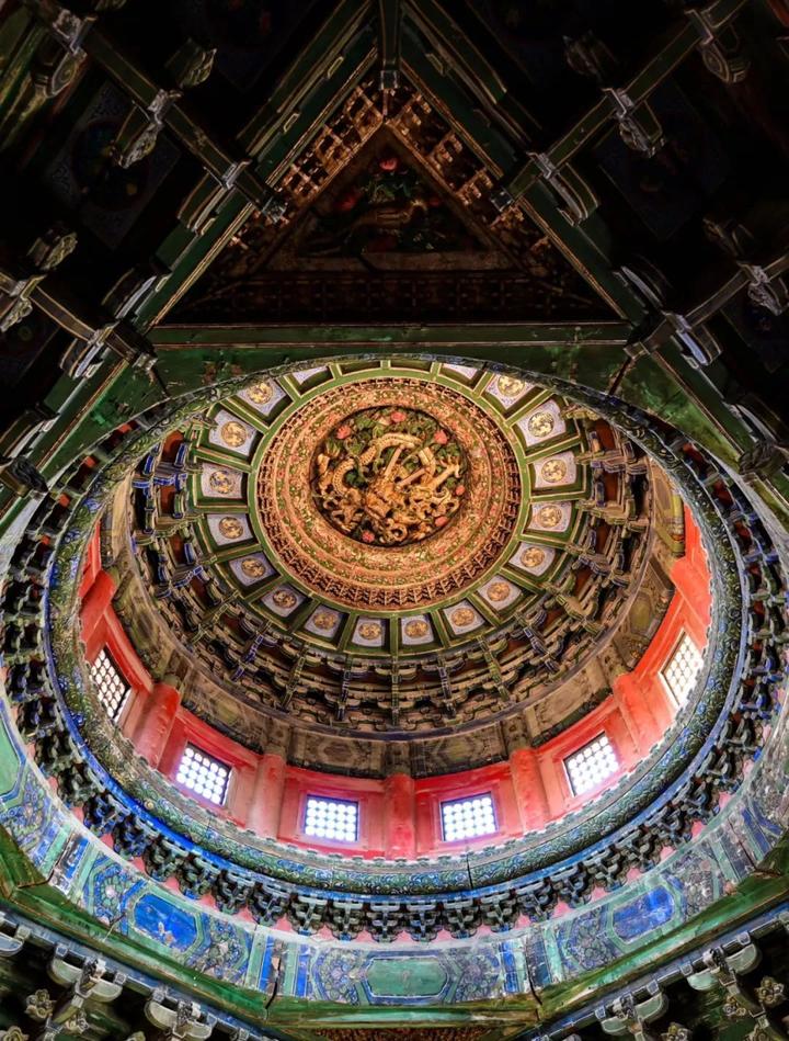 故宫御花园内,立着千秋亭与万春亭这一对“孪生瑰宝”。亭内穹顶绘有双凤盘旋,藻井深处蟠龙贴金,金碧辉煌宛如天上宫阙。