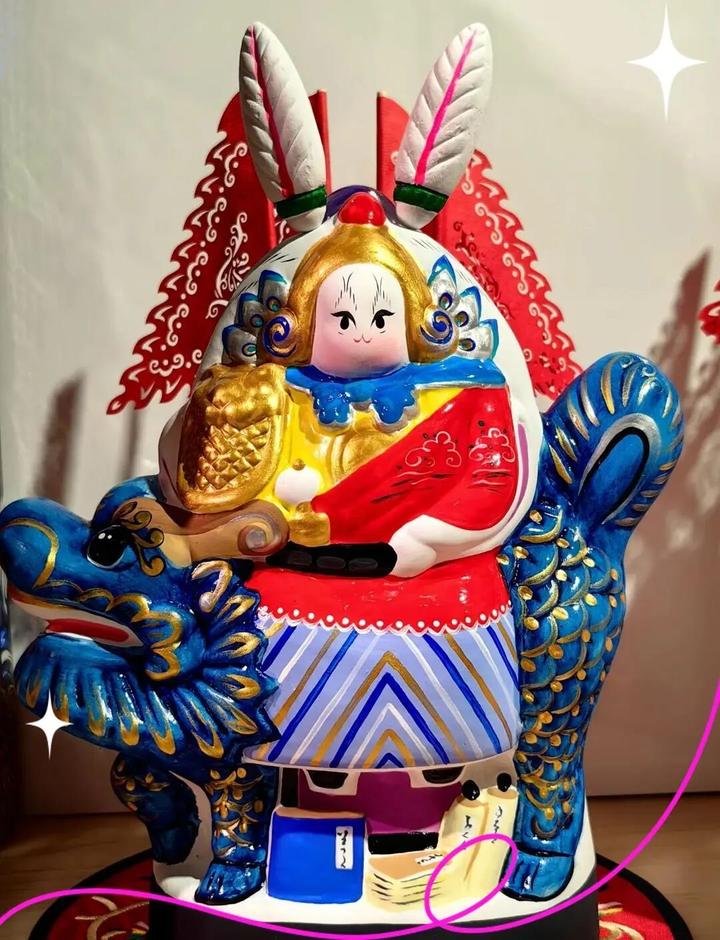 看,这只老北京兔儿爷披上了京剧绒袍。金线绣瑞兽、赤色染吉袍,它活脱脱就是一个从民俗年画里跳出来的吉祥担当。