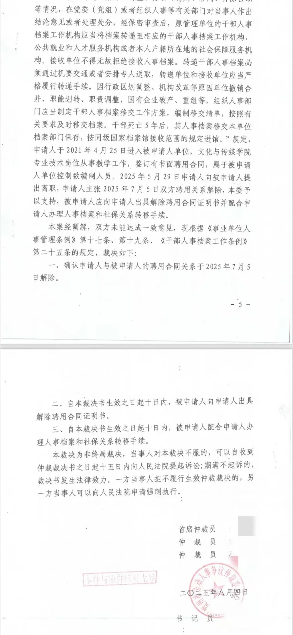 今年8月,仲裁结果确认夏荷与贺州学院的聘用关系解除,贺州学院应配合其办理人事档案、社保关系转移手续。