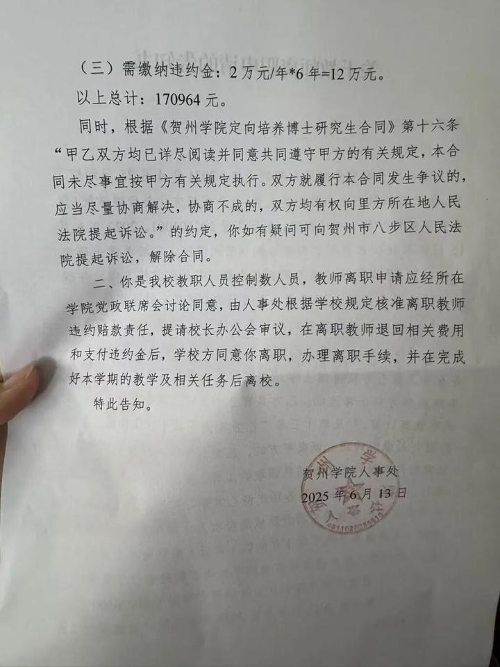 夏荷申请辞职时,贺州学院要求其退还赔偿共计17万元。