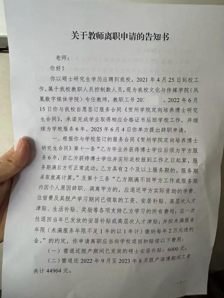 贺州学院称,待夏荷退回相关费用、支付违约金,并完成本学期教学及相关任务后,学校将办理离职手续和人事档案转递。