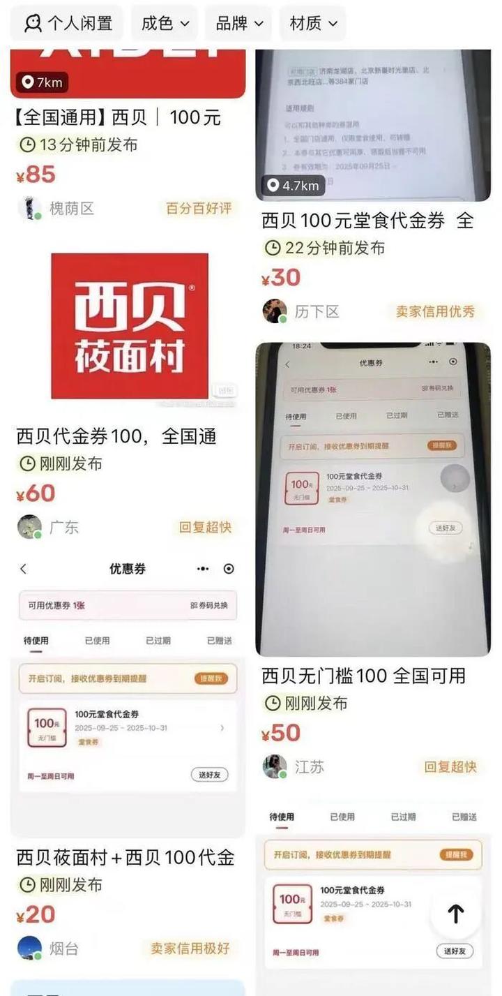 活动开始仅数小时,西贝宽松的规则便催生了新的市场现象。新黄河记者注意到,在闲鱼等二手交易平台上,已出现大量转卖西贝百元券的链接,根据券的可使用时间,售价从30元至80元不等。优惠券迅速“金融产品化”,显示出其在市场的实际流通价值,也侧面印证了“薅羊毛”攻略的可行性。