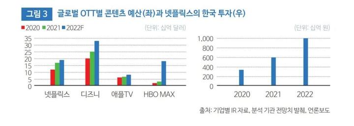 左图为Netflix、迪士尼、appletv、hbomax的三年内容预算规模,单位为10亿美元。右图为Netflix在韩国投资规模的变化,单位为10亿韩元,两个数字均逐年大幅上升